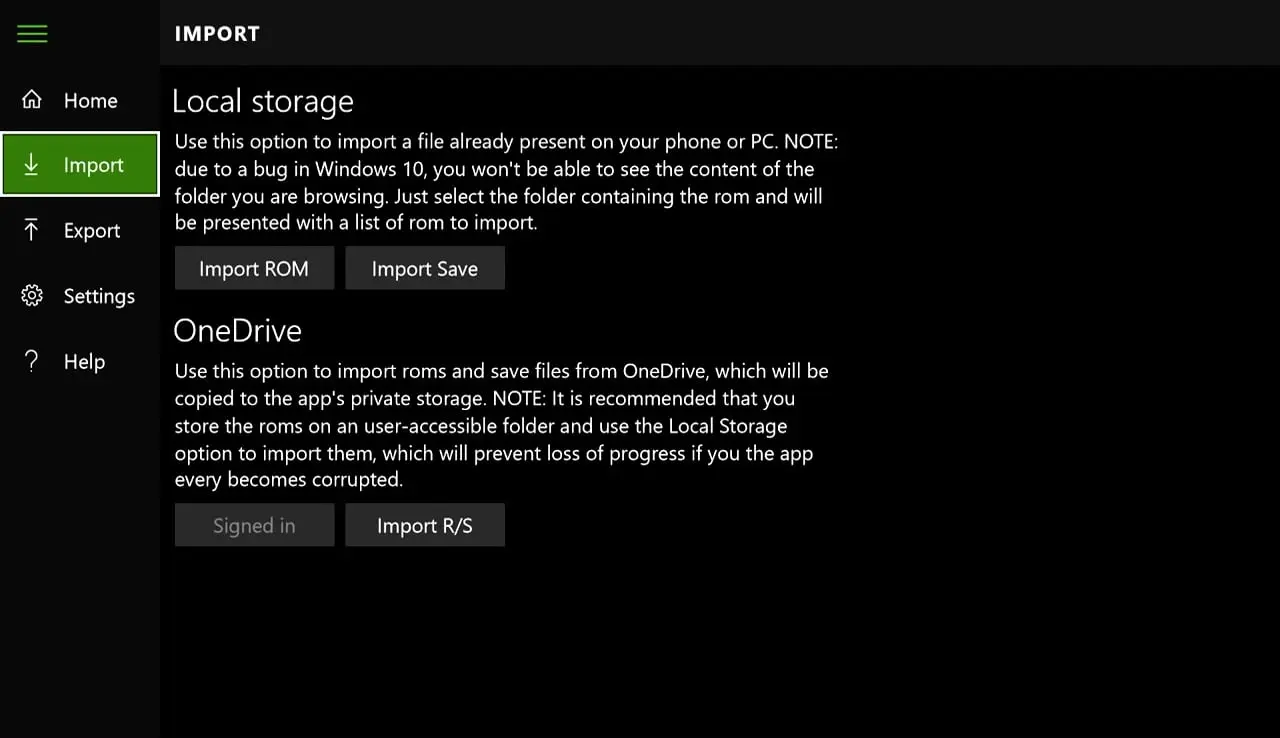 ROMは、クラウドストレージのOneDriveからインポート可能。
